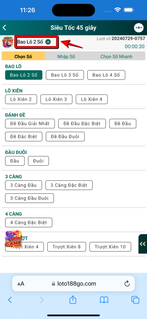 Bước 2 : Chọn kiểu cược bạn muốn cược, ví dụ: bao lô, lô xiên, đánh đề,…Và chọn loại cược như: 2 số, 3 số, xiên 2, xiên 3, xiên 4, đầu, đuôi…